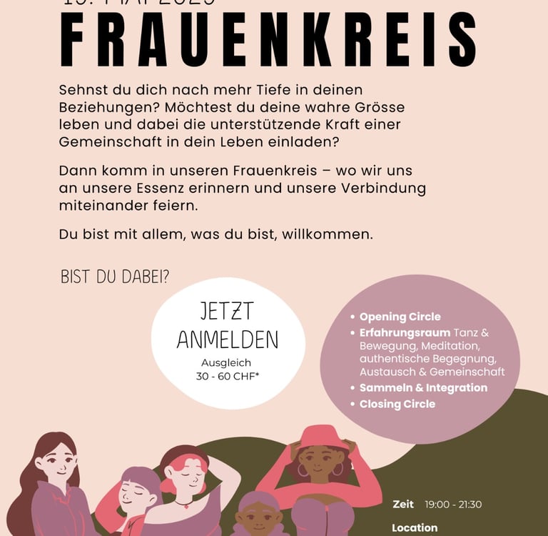 Update: das Datum und das Programm steht (siehe Flyer rechts). Es geht um Tanz, Bewegung, Meditation, authentische Begegnung sowie Austausch und Gemeinschaft. Hast du Lust, auf einen verbindenden Abend unter Frauen?